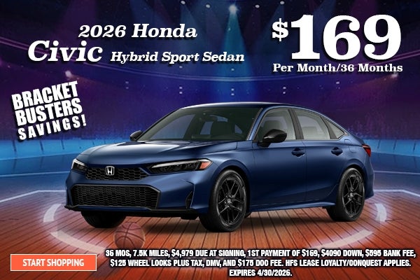 (Model #: FE4F8TJW) for $169 per month for 36 months, with total due at inception of $4,979.00 includes $4,090.00 down payment, $595 bank fee, $125 wheel locks and $169 first month’s payment, excludes sales tax, DMV fees, and includes allowable miles 7,500 per year, with Excellent Tier 1 credit. HFS $500 Loyalty/Conquest incentive applies. This offer is subject to credit approval. Not all applicants will be approved. No security deposit. Due at signing payment of $4,979.00 includes down payment and first month’s payment. Lessee responsible for maintenance, repairs, excessive wear and tear, and excess mileage over 7,500 miles/year at the rate of $0.20/mile. Early lease termination fee may apply. Not all lessees will qualify. Higher lease rates apply for lessees with lower credit ratings. Includes destination fee . Tax, title, DMV fees, and $175 dealer doc fee are additional. Selling Price $29,268.00 Total monthly payments are $6,084. Option to purchase vehicle at lease end is $21,107.10. Financing available through American Honda Finance Corporation. Premium color is $455 extra. Offers cannot be combined with any other advertised offer. See dealer for complete details. Lease and loan quoting is a dynamic process so payments and terms are subject to change prior to contract execution by all parties up to date of actual vehicle delivery. The payment quote above assumes that these taxes and fees will be paid at the time of sale by the customer in addition to the $4,979.00 total due at signing amount stated. If these taxes and fees are not paid by customer at the time of sale, the quoted payment will be higher since these amounts will be included in the amount financed. Lease specials available while supplies last. Residency restrictions apply. Expires 04/30/2026.